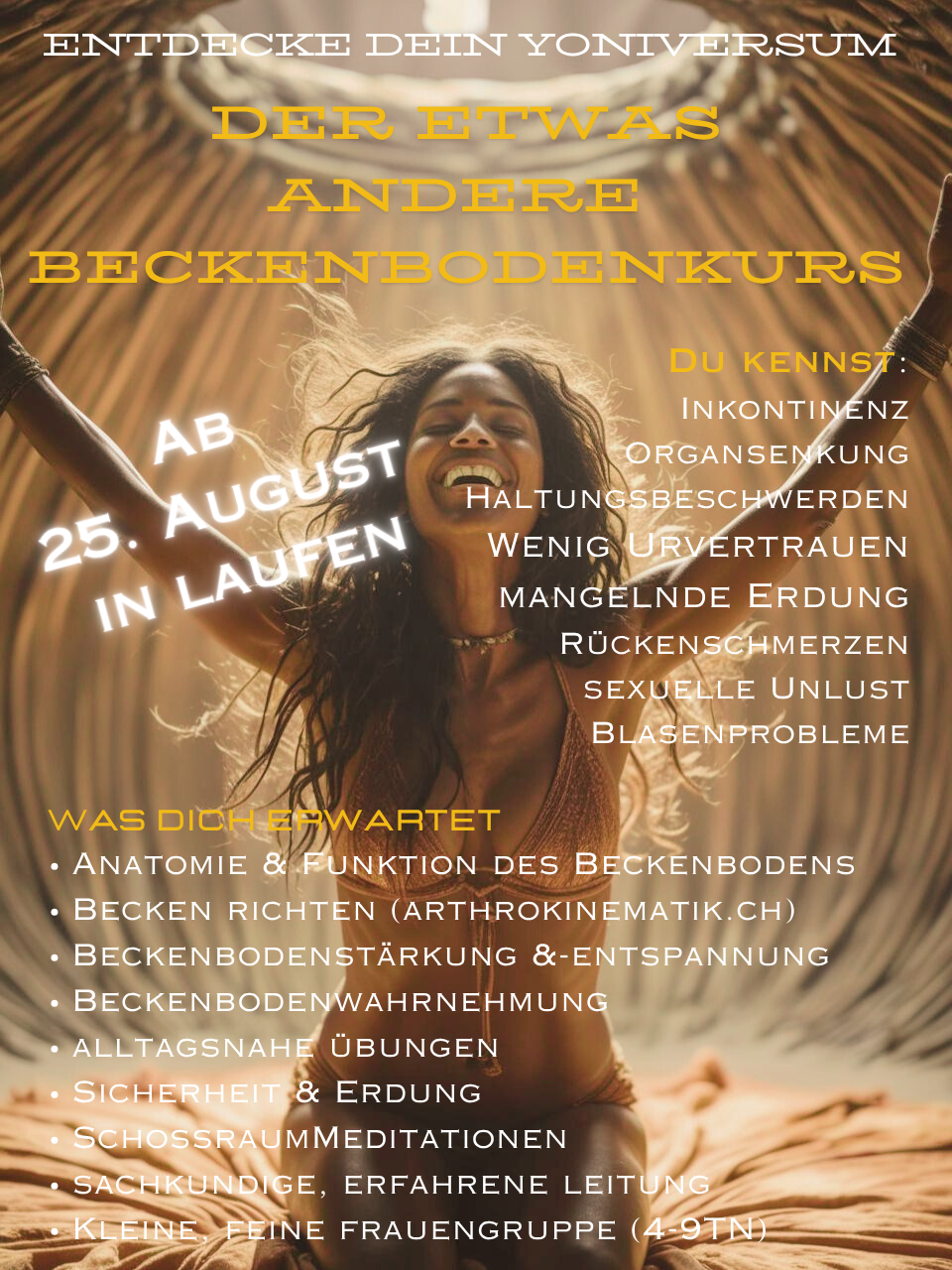 Bei meinen Yoniversum Beckenboden-Kursen kommst Du wieder in Kontakt mit Deinem «da unten», mit Deinem Beckenboden, Deinem Schossraum, mit Deiner "Kraft aus der Mitte" für mehr Lebensfreude, Sinnlichkeit, Genuss, Stabilität, Zuversicht, Sicherheit, Kraft und Entspannung. Dieser Kurs richtet sich an Frauen. Da ich selber eine Frau (mitten in den Wechseljahren) und 3-fach Mama bin, verstehe, spüre und erfahre ich den weiblichen Beckenboden und dessen Bedürfnisse sowie Veränderungen tagtäglich am eigenen Leib. Diesen Erfahrungs- und Lebensschatz gebe ich daher authentisch weiter.